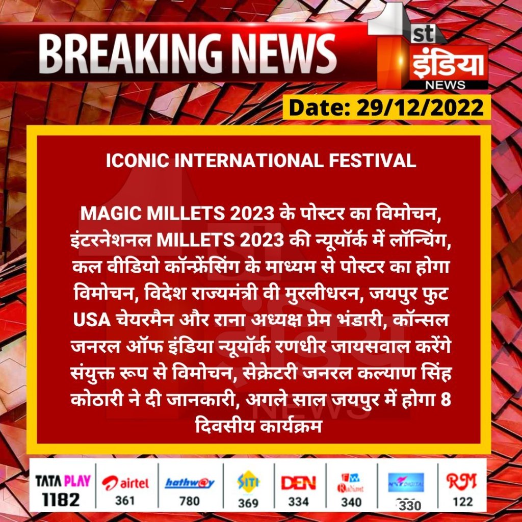 दिसंबर 30, 2022 CONIC INTERNATIONAL FESTIVAL MAGIC MILLETS 2023 के पोस्टर का विमोचन किया जायेगा साथ ही इंटरनेशनल MILLETS 2023 की न्यूयॉर्क में लॉन्चिंग भी आयोजित की जायेगी, कल वीडियो कॉन्फ्रेंसिंग के माध्यम से पोस्टर का विमोचन होगा। इस वीडियो कॉन्फ्रेंसिंग के मुख्य अतिथि श्री वी. मुरलीधरन (Minister of State for External Affairs and Parliamentary, GOI), श्री प्रेम भंडारी (Chair Person: Jaipur Foot, USA | President: Rajasthan Assocciation of North America (RANA), New York), एवम श्री रणधीर जायसवाल (Consul General, New York) रहेंगे। पोस्टर का विमोचन दिसंबर 30, 2022 (US Time-11:30 AM and India Time: 10:00 PM) पर New York में होगा। अगले साल 2033 जयपुर में 8 दिवसीय कार्यक्रम MILLETS 2023 का आयोजन होगा।