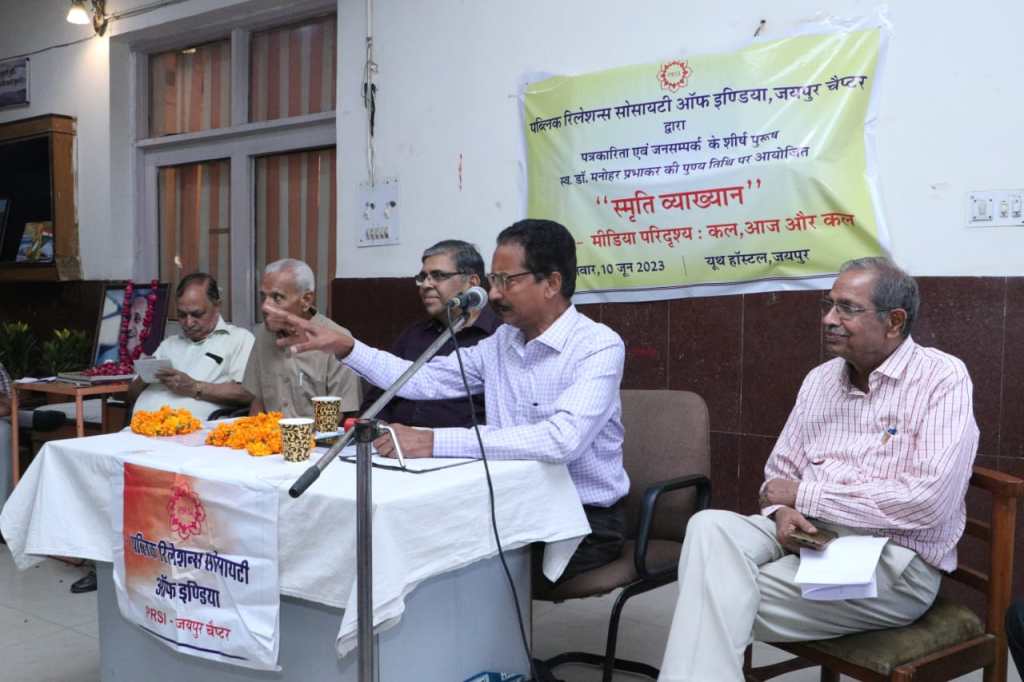 राजस्थान सरकार के सूचना एवं जनसम्पर्क विभाग के पूर्व निदेशक, साहित्यकार, पत्रकार और जनसंचार विशेषज्ञ तथा पब्लिक रिलेशन्स सोसायटी ऑफ इण्डिया जयपुर चैप्टर के संस्थापक अध्यक्ष डॉ• मनोहर प्रभाकर की 6ठी पुण्य तिथि पर शनिवार को ” मीडिया परिदृश्य: कल, आज और कल ” विषय पर एक स्मृति व्याख्यान का आयोजन स्थानीय यूथ हॉस्टल में किया गया।